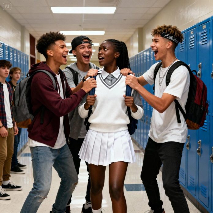 The moment Ethan Clarke opened his locker that Tuesday morning, he heard the sound that made his stomach twist—Rowan Miller and his crew laughing at someone. Their laughter always meant trouble. But this time, it wasn’t the usual shoving or petty vandalism. This time, they had cornered Amara Johnson, the quiet new girl from Georgia, near the hallway water fountain.