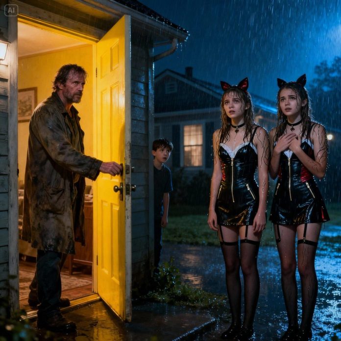 He hesitated. No one ever visited this far out on the edge of town, especially not in a storm like this. When he opened the door, he froze. Standing there were two little girls—identical twins, no older than eight—soaked to the bone, trembling under the downpour. Their matching dresses clung to them, and their lips quivered.
