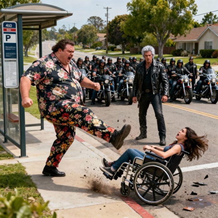 When they saw a man standing over a girl in a wheelchair, the entire line of bikes screeched to a halt. Engines roared as the riders surrounded the bus stop, blocking traffic. Derek froze, his confidence draining as twenty pairs of leather-clad eyes locked on him.