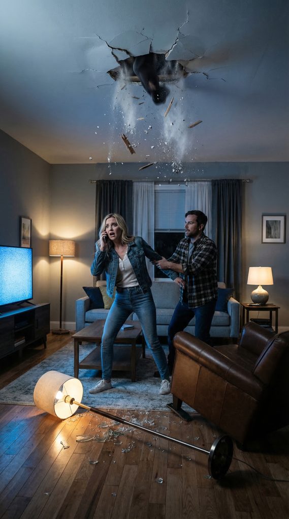 We were sitting in the living room, the music just loud enough to fill the silence that had settled between us lately. My name is Claire Donovan, and that night felt normal—until it didn’t. My husband, Mark, leaned closer than usual, his face tense in a way I hadn’t seen before. “Turn the music down. Now.” I frowned, confused. “Why?” I mouthed instead of speaking. His eyes didn’t leave the ceiling. “Just do it,” he said quietly, his voice tight. Something about it made my stomach twist. I reached for the remote and lowered the volume slowly. The song faded… and that’s when we heard it. Heavy footsteps. Slow. Deliberate. Directly above us. My breath caught. “Mark…” I whispered. “That’s not possible.” We both knew it wasn’t. We were alone. No guests. No one upstairs. The house had been empty all evening. The footsteps stopped. Silence. Then—another step. Louder this time. The ceiling creaked under the weight. Mark grabbed my wrist suddenly. “Don’t move,” he whispered. I froze, my heart pounding so hard it felt like it would give me away. Another step. Then a dragging sound. Like something heavy being pulled across the floor. My skin crawled. “Who’s up there?” I whispered. Mark shook his head slowly, his face pale. “No one should be.” The words hung in the air. Then a loud thud shook the ceiling, dust falling down around us. I flinched. The footsteps resumed—faster now. Moving back and forth. Too fast for a normal person. Panic surged through me. “We need to leave,” I said quickly. Mark didn’t argue. He stood, pulling me toward the front door. But before we reached it, the footsteps stopped again. Completely. The silence felt heavier than the noise. Then, from directly above us, a slow creak echoed… like someone leaning down, listening. My breath hitched. And then—three slow knocks came from the ceiling.