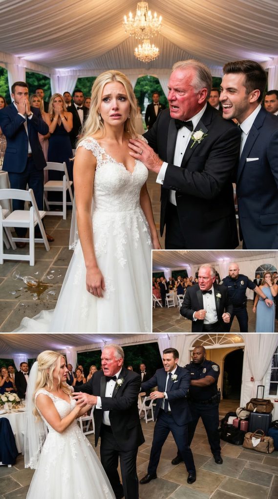 I stood just outside the venue, the sound of laughter and music continuing behind those doors like nothing had happened. To them, it hadn’t. I was gone. Problem solved. But I wasn’t leaving. Not yet. I pulled out my phone, my hands steady, and made a single call. “It’s done,” I said. That was all. Within minutes, the shift began. The music inside cut off abruptly. Conversations dropped into confusion. Then came the voices—questions, irritation, the kind of noise that builds before something breaks. I stepped closer to the entrance, just enough to hear clearly. Chairs scraped. Someone raised their voice. Then the doors opened suddenly. A group of security personnel moved inside quickly, their presence immediate and unmistakable. Not subtle. Not polite. Direct. I could hear my father’s voice instantly. “What is the meaning of this?” he demanded. No answer. Just movement. The guards didn’t hesitate. They moved straight toward him—and Eric. “Sir, you need to come with us,” one of them said firmly. Eric laughed at first, shaking his head. “You’ve got to be kidding me,” he said. “This is my wedding.” The guard didn’t react. “You need to leave,” he repeated. My father stepped forward, anger rising fast. “Do you know who I am?” he snapped. But authority had already changed hands. Within seconds, tension exploded. Guests stood up, backing away as the guards moved in closer. Eric tried to pull away as they reached for him. “Don’t touch me!” he shouted, knocking into a chair. It tipped over, crashing loudly against the floor. My father raised his voice again, louder this time. “This is unacceptable!” But no one was listening anymore. Because they weren’t in control. Not here. Not anymore. Then came the moment everything spilled outside. The doors burst open, and the chaos followed. Guests rushed out, whispering, shocked. And then my father and Eric were forced out next. Bags. Decorations. Personal belongings—everything being carried out behind them and dropped onto the ground like it didn’t matter. Just like me. My father turned, furious, scanning the scene. “What is going on?!” he shouted. And that’s when he saw me. Standing there. Waiting.