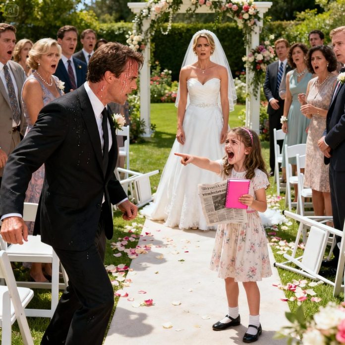 All heads turned toward the aisle. Standing there was Sophie, Melissa’s 8-year-old daughter, clutching a small pink diary to her chest, her face red from crying. The atmosphere froze. Melissa’s hand trembled as she lowered her bouquet. “Sophie, honey, what are you talking about?” she whispered, her voice shaking.