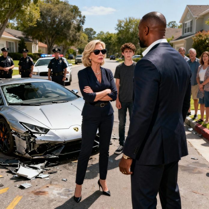 The owner, Marcus Thompson, a successful African-American entrepreneur, rushed out of his nearby home, disbelief flooding his face. His Lamborghini—the pride he had worked a decade for—was crumpled beyond recognition. Standing by the wreckage was a trembling teenager: Tyler Brooks, the son of Karen Brooks, the notoriously self-righteous president of the local HOA.
