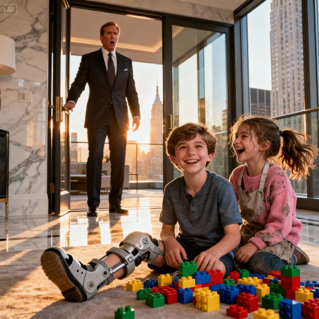 He followed it — and stopped cold. Ethan sat on the floor, building a Lego tower with Lily, the maid’s daughter. She was ten, wearing an old pink sweater, her hair tied in a messy ponytail. She made funny voices for the Lego figures, and Ethan’s laughter filled the air again. Lily didn’t seem to notice the expensive suit or the intimidating man in the doorway. She just turned and said, “Mr. Hemsley, Ethan’s an architect! Look at this!”