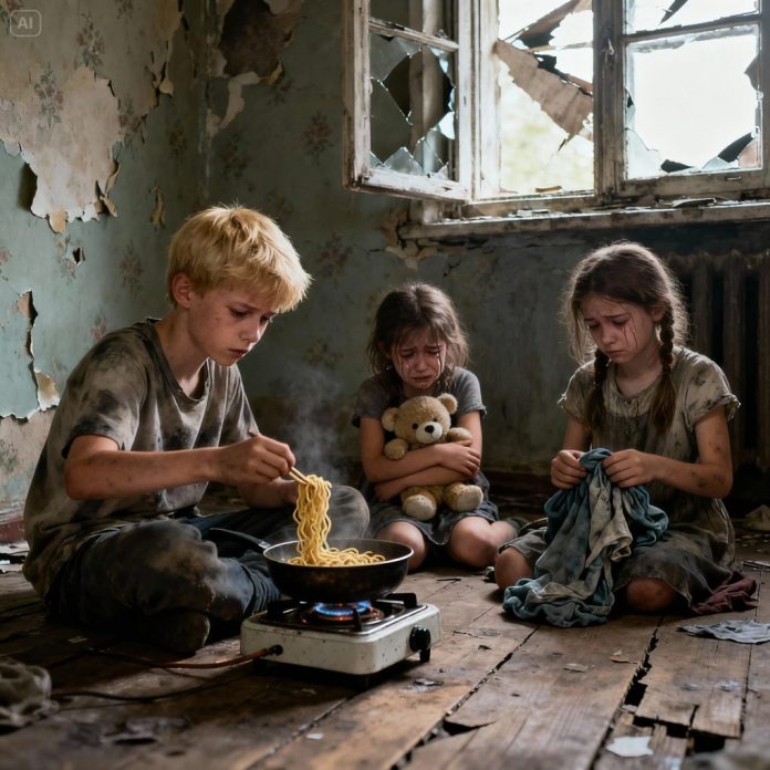 Inside, a young boy stirred a pot of instant noodles over a small gas burner. His name was Ethan, the oldest — only twelve, but his hands moved like someone twice his age.