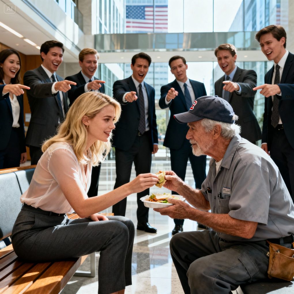 Emma Thompson, a new intern barely two weeks into her job, smiled awkwardly as she handed half of her sandwich to the old man in the gray uniform. He had kind eyes, deep wrinkles, and a calm presence that contrasted sharply with the loud confidence of the young executives around her.