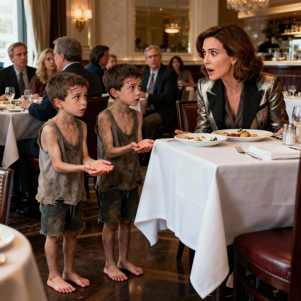 Two homeless twin boys walked up to the millionaire’s table and asked, “Ma’am, could we have some of your leftovers?” The millionaire looked up and froze in shock when she saw that the boys looked exactly like her two sons who had gone missing long ago…