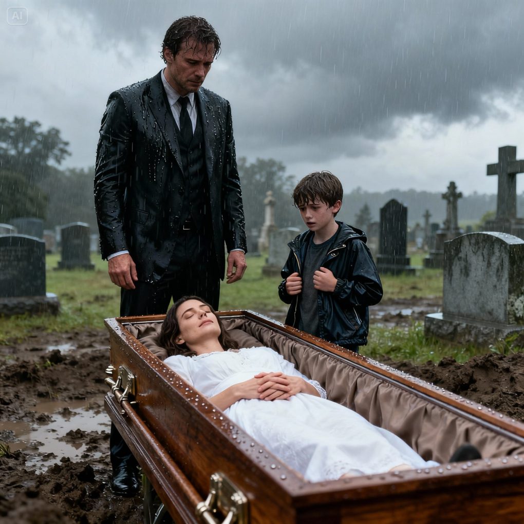 Mark Ellison stood beside a small wooden coffin, holding his son’s trembling hand. Inside that coffin was his wife, Emily — the love of his life, gone at just 32.