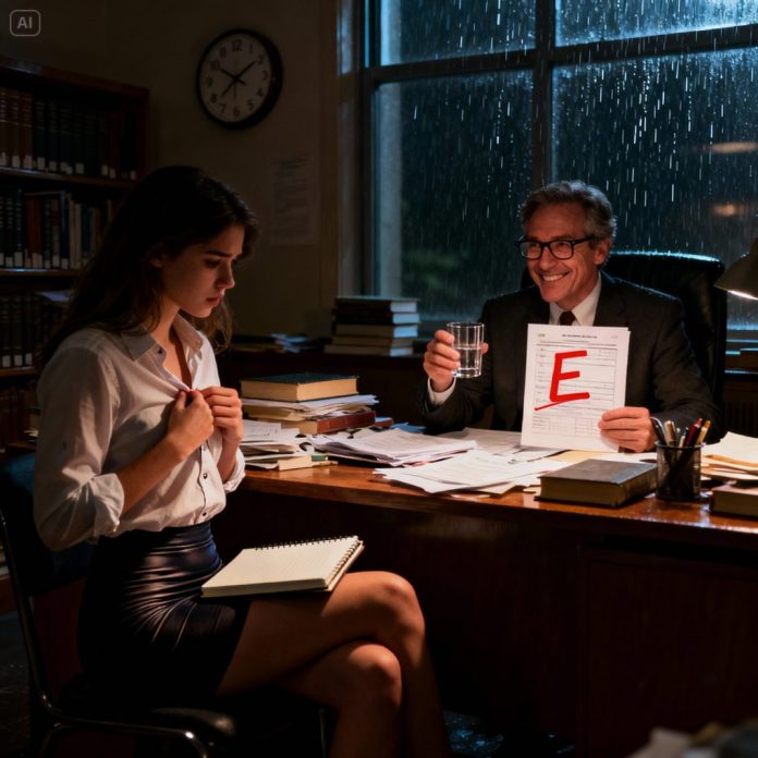 “I’m disappointed,” he began. “You’re smarter than that grade suggests. But grades… can be flexible if a student shows the right kind of motivation.” His words dripped with suggestion. Emily stared at the exam paper, the bold red ‘D’ mocking her. She knew what he meant. Every fiber of her being told her to run, but fear and shock locked her in place.