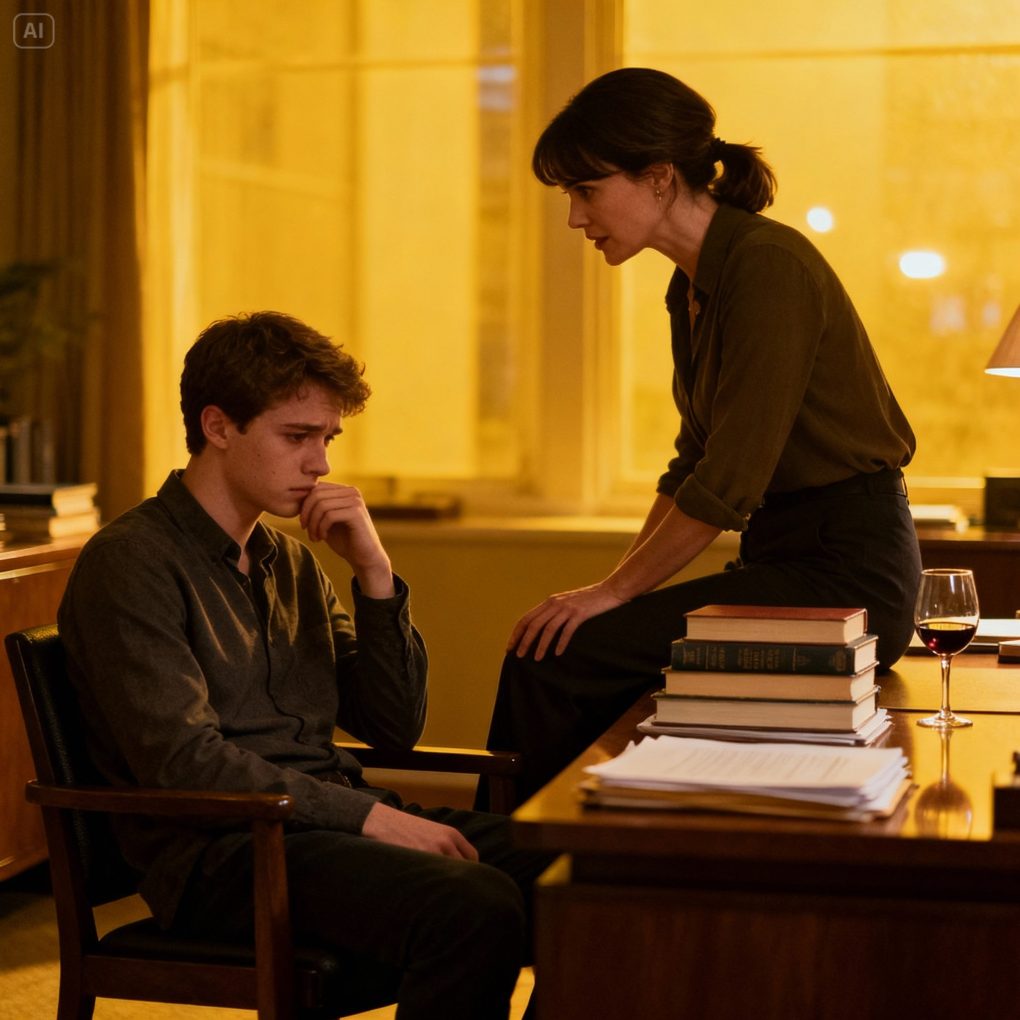 Inside, papers were spread across her desk. The blinds were drawn. She looked different — not cold and distant like in class, but serious, even worried.