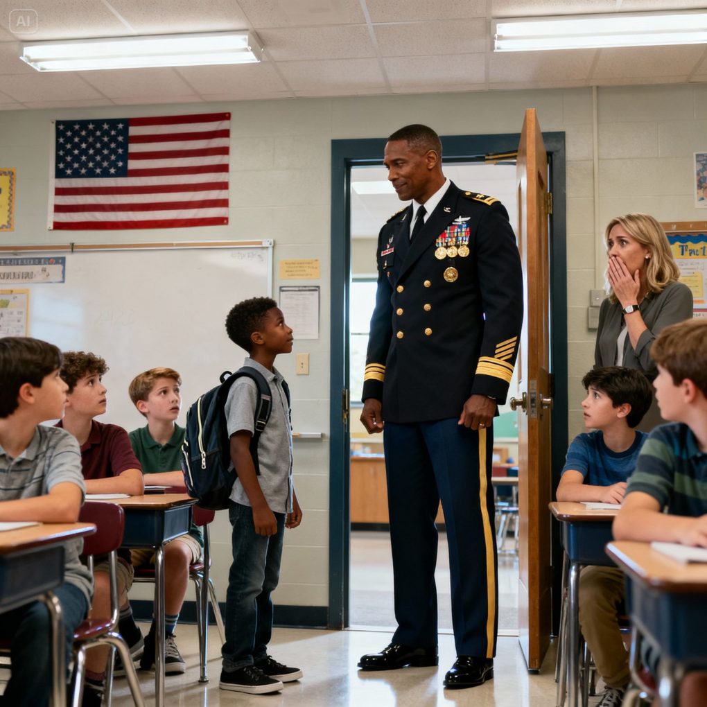 Ten minutes later, as Ms. Carter was teaching fractions, a sharp knock echoed through the hallway. The door opened, and a tall man in a crisp military uniform stepped in. His polished shoes, shining medals, and commanding presence silenced the class instantly.