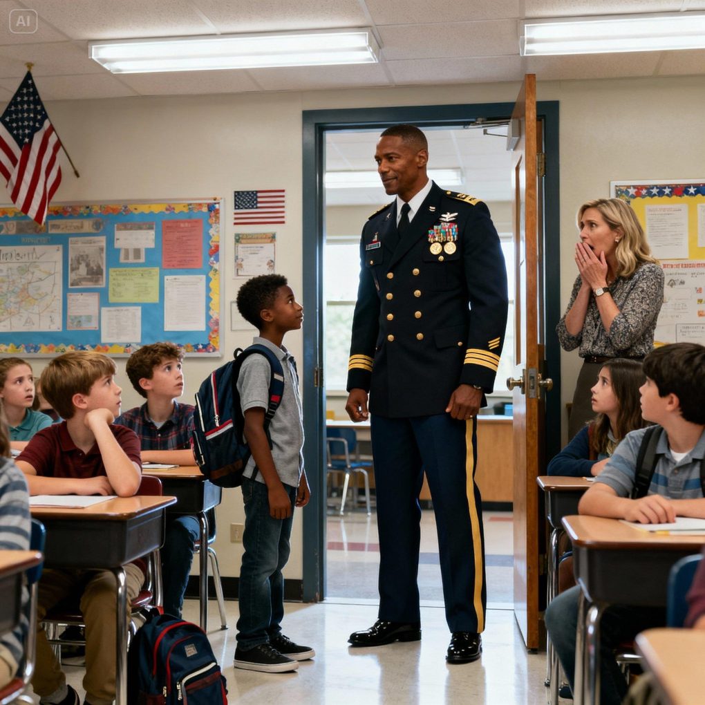 When twelve-year-old Malik Turner stood up during career-day introductions and said, “My dad works at the Pentagon,” the classroom went silent for half a second—before erupting into snickers. His teacher, Mrs. Howard, forced an awkward smile as if she didn’t quite believe him either. And his classmates, especially a boy named Ethan Miller, wasted no time mocking him, whispering loudly, “Stop lying, Malik. Your dad doesn’t even show up for parent meetings.” The humiliation burned Malik’s cheeks, but he repeated, firmly, “He really works there. He’s coming today.”
