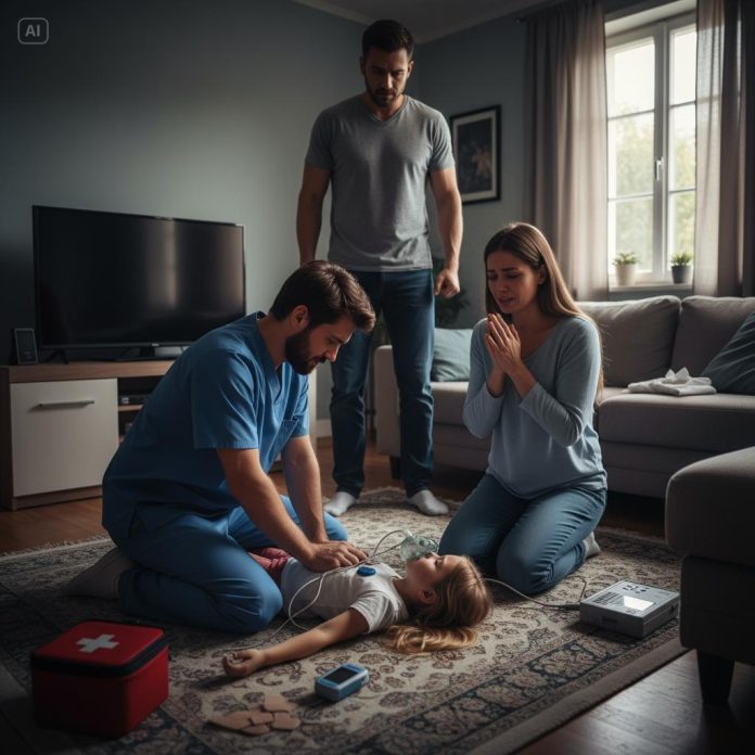 When I came home from a business trip, I saw my daughter collapsed by the door. My husband calmly said, “You’re overreacting, I just punished her a little.” Tears blurred my eyes as I called for an ambulance. But when the paramedic arrived and looked at my husband, he froze. Then he whispered, “Ma’am… is that your husband? Because actually…