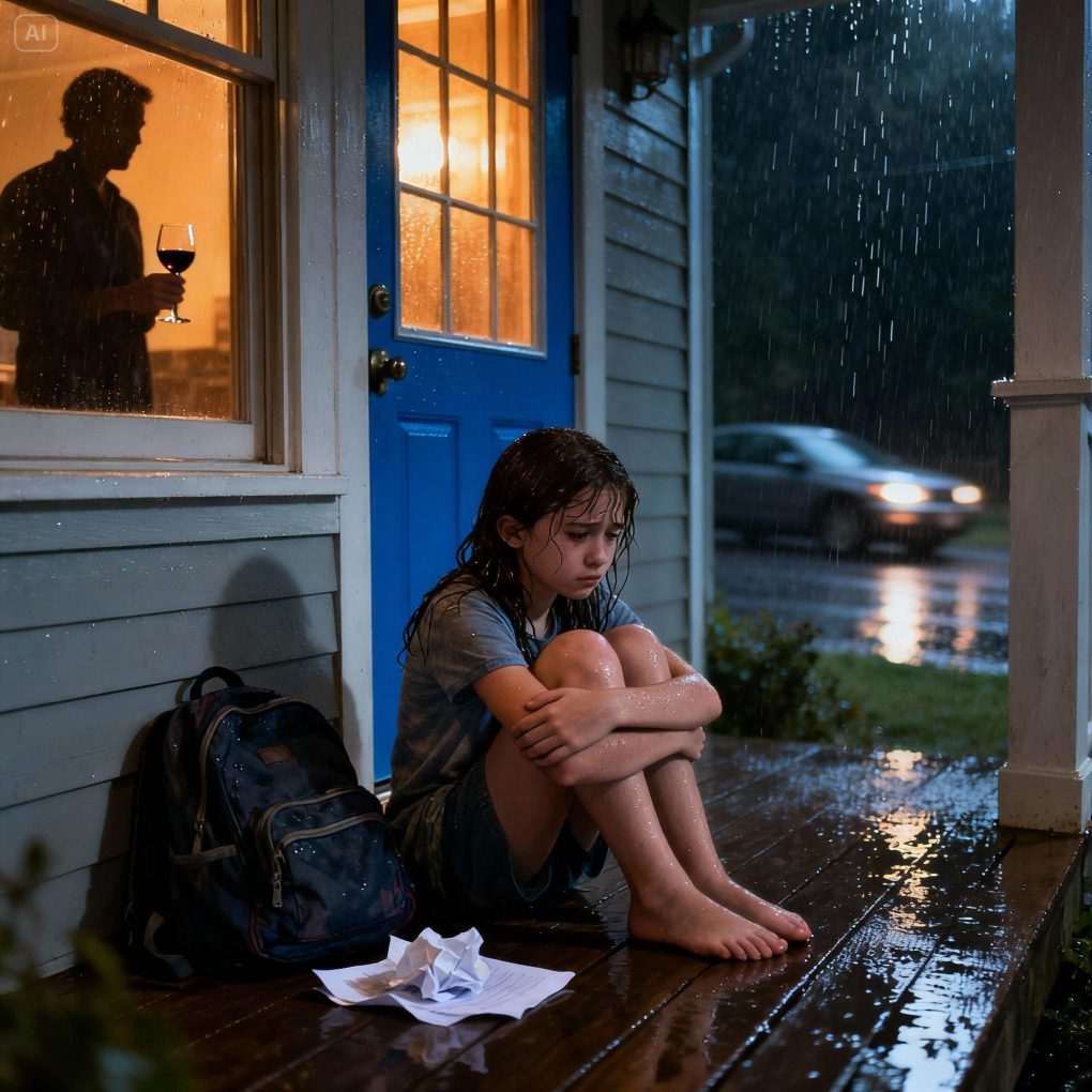 Rain dripped from Lily’s hair as she stood at the front door, shivering, clutching her soaked backpack. She turned the key again and again — but it didn’t fit. “Mom must’ve changed the lock,” she whispered, confused. The porch light stayed off. No answer came when she knocked. Hours passed. Her sneakers squelched in puddles as the night deepened and the temperature dropped. Five hours later, headlights flashed across the driveway. Relief flooded her face — until she saw who it was.
