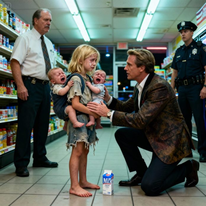 At that moment, the millionaire’s heart tightened. He saw not a thief, but a child abandoned by the world. A silence fell across the store as he slowly stood and took out his wallet. “I’ll pay for everything she needs,” he told the manager. Then, turning to the officer, he added, “There’s no crime here tonight—just a cry for help.”