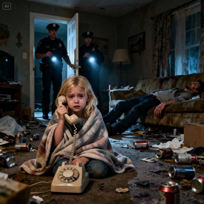 Within seven minutes, Officer Ryan Keller and his partner Mia Grant pulled up to a small two-story home at the edge of town. The front door stood wide open. A terrified six-year-old girl was on the porch, clutching a stuffed bunny.