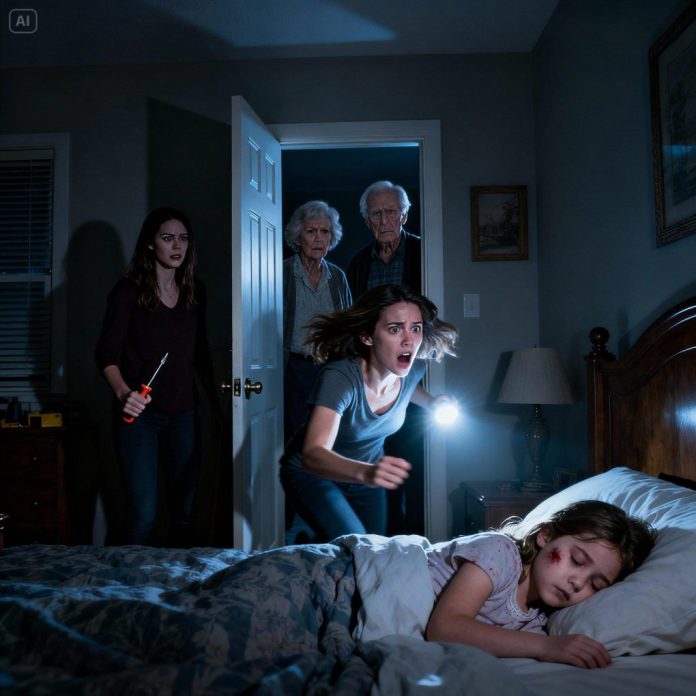 At 2 a.m., my older sister stabbed/poked the face of my 6-year-old daughter with a screwdriver while the child was sleeping. The little one didn’t even cry—she was completely motionless. My parents burst out laughing, saying, “finally some peace and quiet.” My sister smirked and added, “anyway, I’ve never liked that kid’s face.” I rushed to my daughter’s side, trembling, but they mocked me—”you’re overreacting,” my dad jeered. Then they surrounded me, whispering, “let it go—your little sister isn’t herself anymore. It was just an accident.” My hands shook as they closed in, but somehow I managed to press the SOS button on my phone before they noticed. When the police arrived a few hours later, what unfolded in court left everyone stunned—even the judge couldn’t hide his shock.