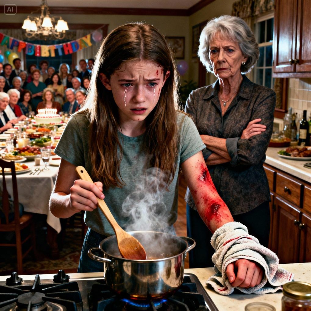 The scream was so sharp it sliced through the hallway. Emily, my 15-year-old daughter, stumbled back from the stove, clutching her wrist as boiling sauce dripped down her arm. Her skin reddened instantly, blistering along the edge. Before she could even breathe through the pain, my mother, Marianne, looked up from her seat at the dining table and said flatly, “She can still stir with the other hand.”