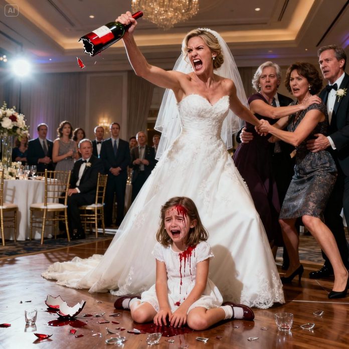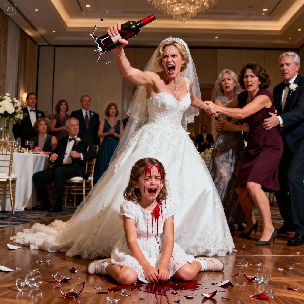 During my older sister’s wedding, my naive 6-year-old daughter unwittingly sat down on the seat. My sister spun around sharply, her voice sharp and cold from anger: “Why do you dare sit here? You will have to pay the price!” Before everyone could react in time, she snatched a wine bottle and struck it against my young daughter’s head with full force. My daughter cried out, blood and wine pouring down its face. I rushed over, but my sister countered again—until it slipped, falling to the floor, its skirt drenched in red wine. When I tried to reach my child, my mother restrained me, snarling that my daughter “deserved to be taught respect,” while my father hurried to soothe my sister. Then the doors flung open—my husband entered, beheld his daughter’s face, and what he did next left the whole venue in silence.