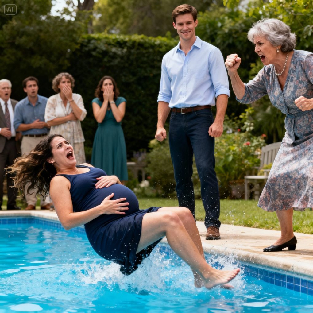 The embarrassment burned through me, but nothing could prepare me for what happened next. Elaine, who had always criticized me, stepped closer with a cold, almost triumphant look. Before I could back away, she slammed her fist into my swollen belly—so hard I lost my balance. Gasps filled the air as I toppled backward into the pool.