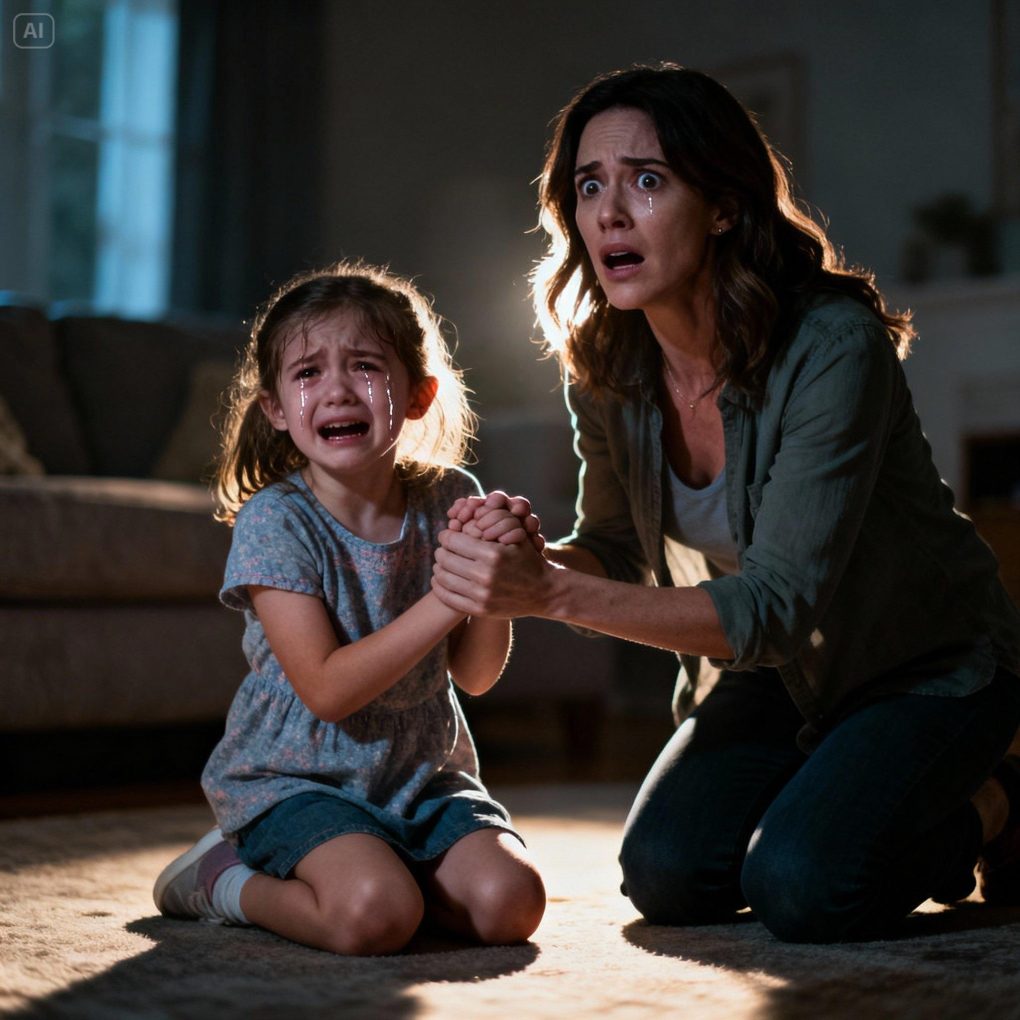 My five-year-old daughter, Emily, had dropped to her knees on the living-room floor, her tiny fingers digging desperately into my hands as if holding on for dear life. Her voice cracked through panicked sobs.