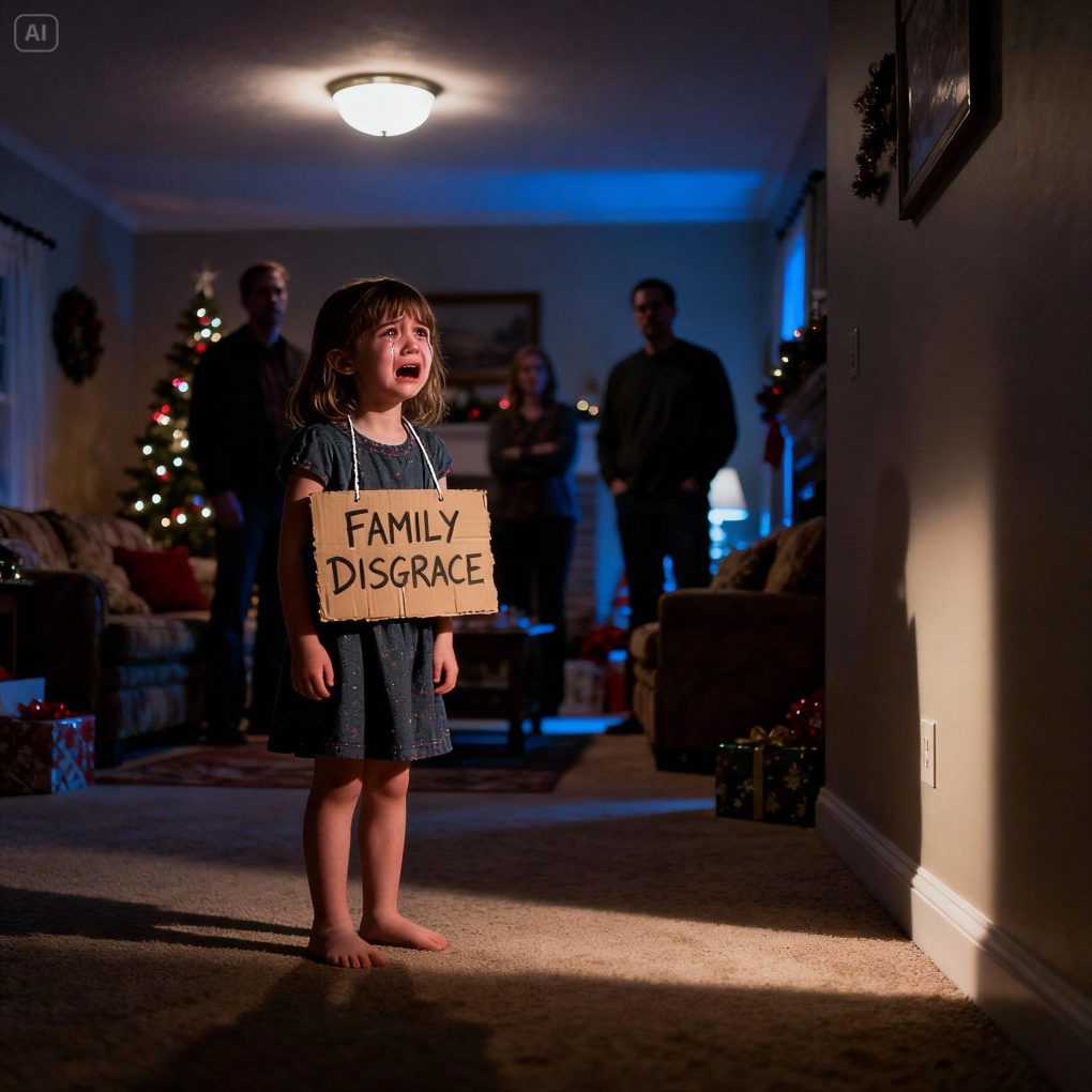 On Christmas night, while the rest of the world celebrated with warmth and joy, I opened the security camera on my phone during a break at work — and froze. There, in my mother’s living room, was my seven-year-old daughter, Emma, standing in a corner with a cardboard sign hanging from her neck. On it, in thick black marker, were four words that made my blood turn to ice: “THE SHAME OF THE FAMILY.”