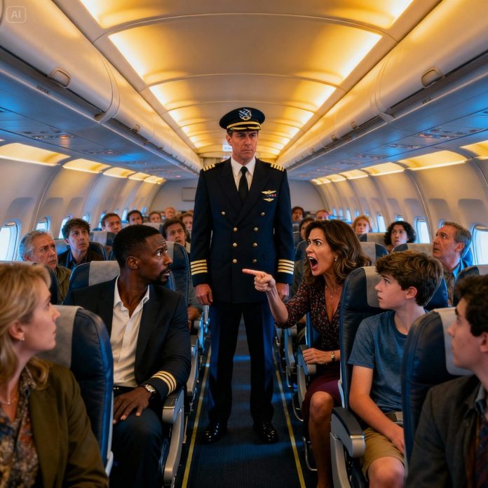 And then—just as the argument was reaching a boiling point—the cockpit door clicked open. Out stepped Captain Marcus Harlan, a tall, calm man with silvering hair and a presence that commanded attention without even raising his voice. He walked down the aisle deliberately, pausing beside our row.