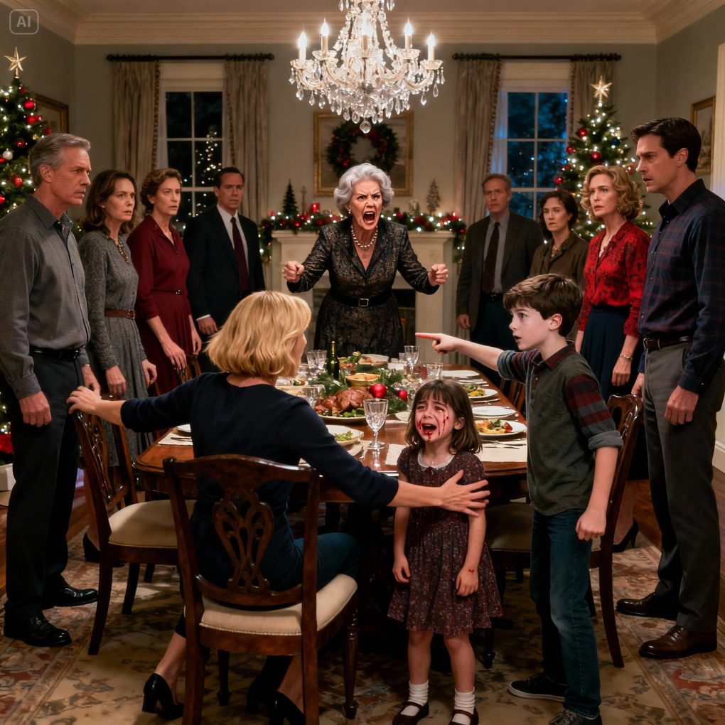 During Christmas dinner, my mother-in-law suddenly slapped my 5-year-old across the face. “Shut up — you’re just like your worthless mom,” she snapped. Everyone else kept eating, pretending nothing happened, while my daughter’s lip began to bleed. Then my 8-year-old son looked her in the eye and said, “Grandma, should I show them the bruises you told me to cover up?” The room went silent. No one moved…