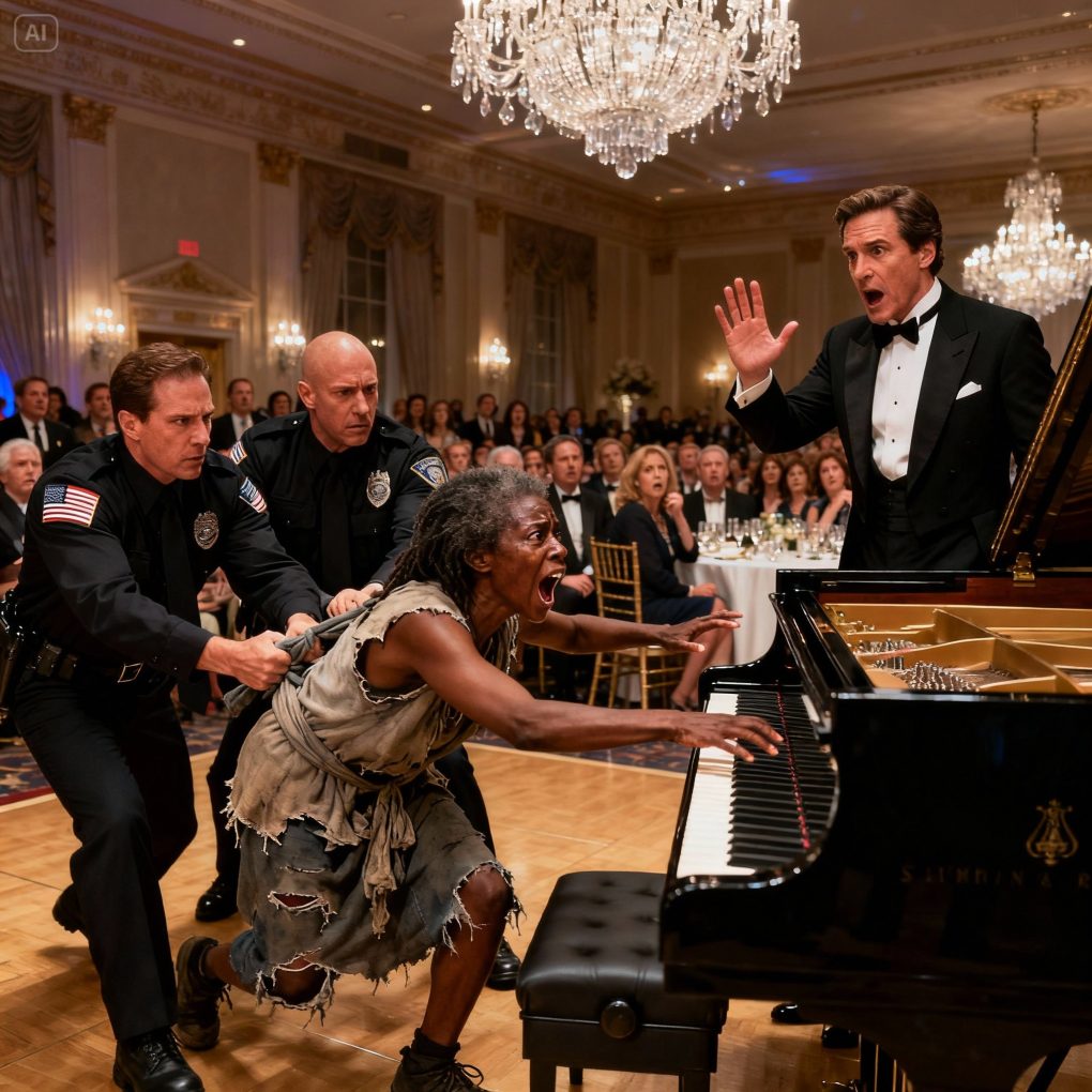 The gala unfolded in a chandelier-lit ballroom at the Crestbourne Hotel, where satin gowns rustled and champagne flutes chimed as donors mingled around marble columns. Yet the elegance shattered in an instant when chaos erupted near the entrance. Two security guards were dragging a frail, shivering Black woman whose clothes were torn from months of living on the streets. Her voice cracked as she struggled, “Please — just let me play the piano for something to eat!”
