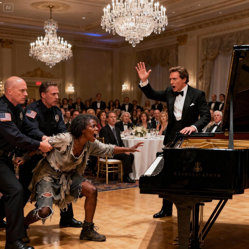 Two security guards were escorting a thin, exhausted woman toward the exit. She wore a torn gray coat, her shoes barely holding together. Her dark curls were unkempt, and her eyes — tired but burning with something fierce — darted toward the grand piano on stage.
