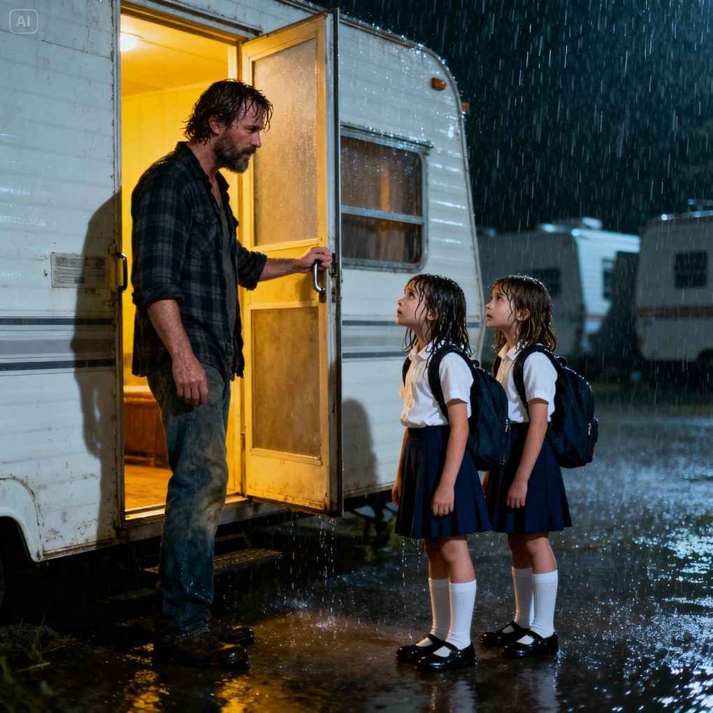 On a freezing November night in the small town of Alder Creek, Daniel Rowe—a 32-year-old single father working two jobs—was finishing dinner with his eight-year-old son, Liam, when a sudden knock echoed through their tiny, weather-beaten house. Rain hammered the roof, wind howled against the windows, and Daniel almost ignored the sound, assuming it was a branch hitting the porch again. But then he heard it a second time—soft, hesitant, almost scared. He opened the door and froze. Standing under the flickering porch light were two little girls, no older than seven. They were identical, soaked from head to toe, clutching each other with trembling hands.