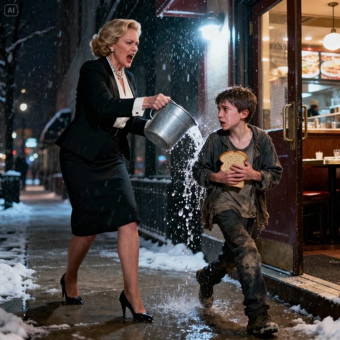 Rain had just begun to fall when Marcus Hale, the owner of the upscale bistro “Silver Quill,” stormed out from behind the marble counter. His voice sliced through the hush of clinking glasses and soft jazz. “Get out!” he roared, snatching a half-full glass of water and throwing it at a small, trembling boy near the door. “You’re frightening my customers!”