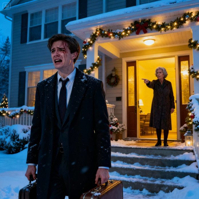 The cold December air bit into Lucas Hartley’s cheeks as he stepped out of the taxi, suitcase in hand, staring at the warm glow of the house he used to call home. After a year of barely speaking to his family—mostly due to their growing indifference—he had convinced himself that Christmas might heal old cracks. His flight had been delayed, the roads icy, but he arrived with a hopeful smile and a carefully wrapped gift for his mother.