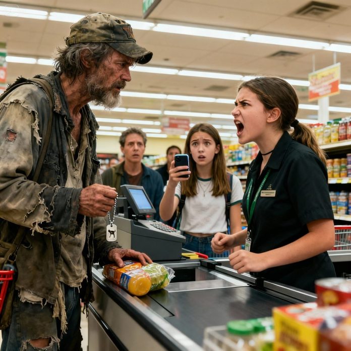 A Homeless Veteran Walked Into a Grocery Store With Only $5, Hoping to Buy a Small Meal — but When a cashier mocked him and told him to “stop pretending to be a hero,” the entire line went silent. A teenage girl stepped forward, pulled out her phone, and said something that made every shopper turn around. Within minutes, the store manager rushed over… and what happened next shocked everyone.