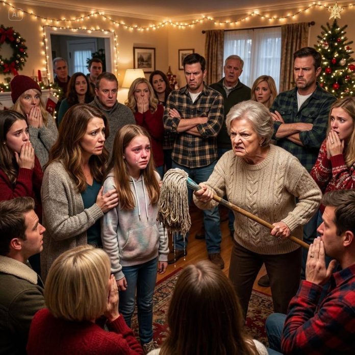 On Christmas Eve, in a room filled with warm lights and twenty guests chatting over wine, my mother suddenly called out, “Sophia, come here.” Everyone turned. My daughter—twelve, shy, and painfully polite—stepped forward. That’s when my mother handed her a dirty floor mop, the strings still damp and gray.