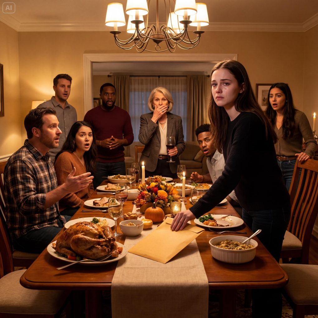 At Thanksgiving dinner, my mother raised her glass and sneered, “My eldest daughter lives luxuriously, successful… and then there’s you—oh, what a series of disappointing choices.” The whole table laughed with her, while I sat still, gripping my napkin tightly. But when she continued praising my sister like a queen, I stood up, placed an envelope on the table, and said, “If you admire her life that much… you should know the truth behind it.” The room fell silent instantly.