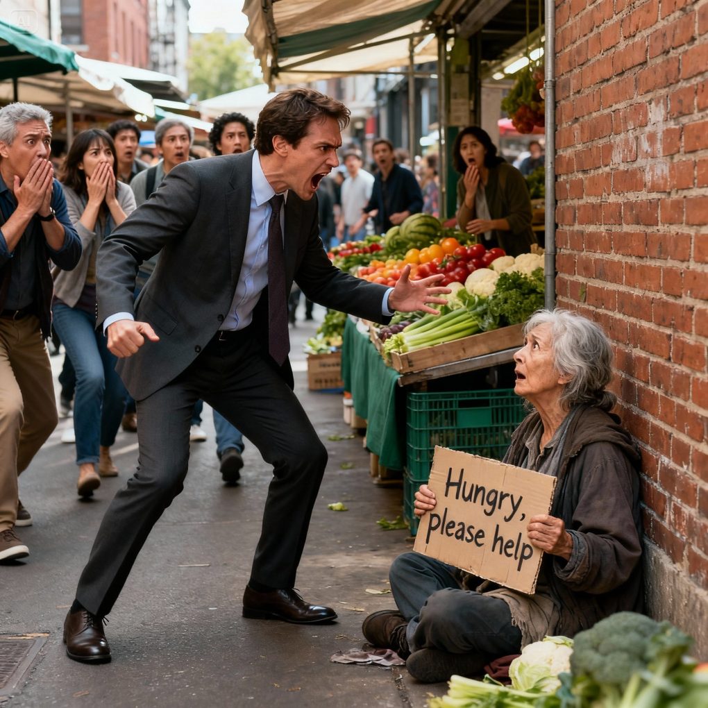 As he approached a produce stall, he bumped into a thin homeless woman standing quietly at the edge of the line. Her clothes were worn, her hair graying, and she held a small paper cup filled with coins. Ethan felt annoyance surge. Without thinking, he shoved her aside. “Move,” he snapped. “You can beg somewhere else.”