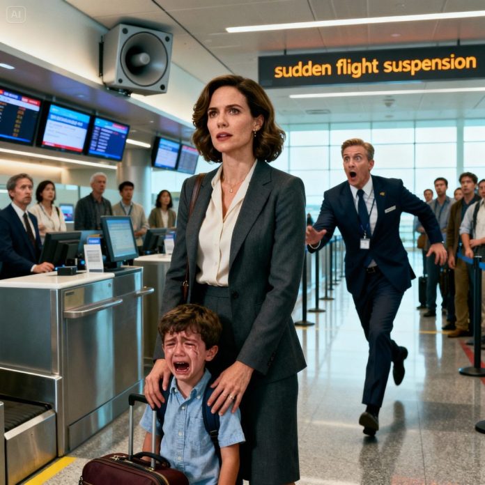 Right at the boarding gate, the ground agent stopped me with an outstretched hand: “Your ticket has been canceled. We need the seat for a VIP.” My son burst into tears, clinging to my hand. I didn’t yell, didn’t argue. I simply opened my phone and sent a short message. Five minutes later, the airport speakers crackled to life, the voice trembling: “Attention… this flight has been suspended by order of the Security Command.” The airport manager rushed over, pale as a sheet. “Ma’am… a terrible mistake has been made.”