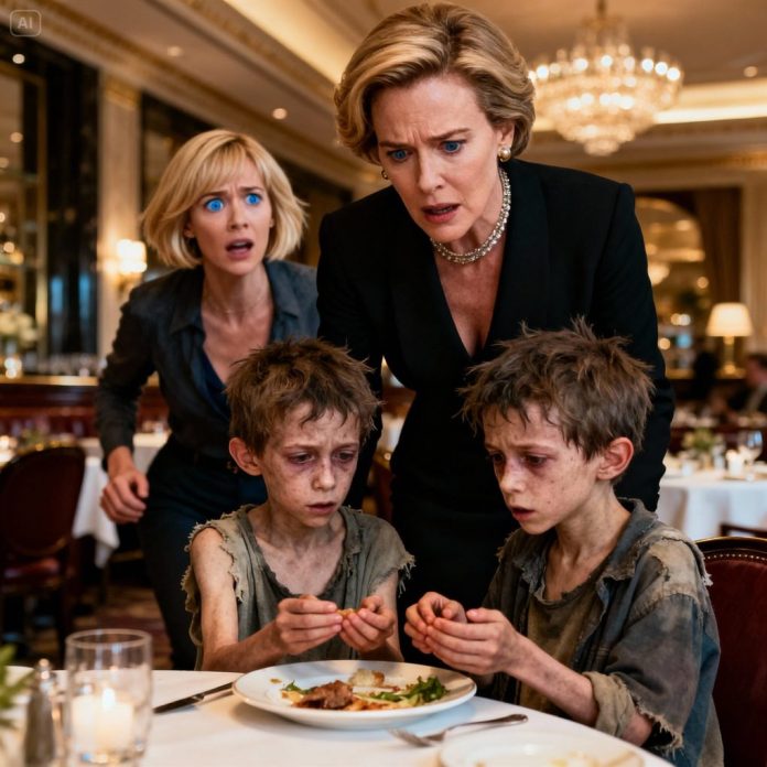In the middle of the upscale restaurant, two scruffy little twin boys approached the table of the wealthy woman. One of them timidly asked, “Ma’am… could we have some leftover food, please?” She looked up—and her heart nearly stopped. Those eyes, that nose… identical to the two sons she had been searching for for years. Her voice trembled as she whispered, “Who… are you? Why do you look so much like their mother?” The twins looked at each other—and their reply began to unravel a devastating secret.