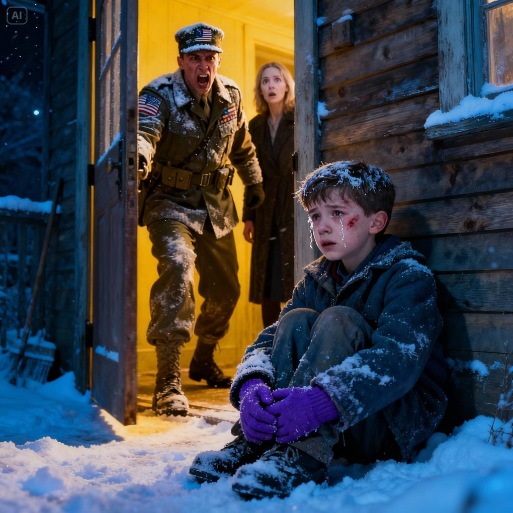 The little boy stood trembling in the heavy snow, his small hands purple from the cold, his cheeks covered in dark bruises. His stepmother shouted: “Stand there all night so you learn your lesson!” The boy sobbed: “I’m so cold… I’m sorry…” At that very moment, the door burst open. His father—a soldier—had come home early. He froze in horror when he saw his son on the verge of collapsing. He roared, his voice shaking with fury: “What have you done to my son?!” The stepmother’s face turned deathly pale—and in that instant, she knew… her reckoning had begun.