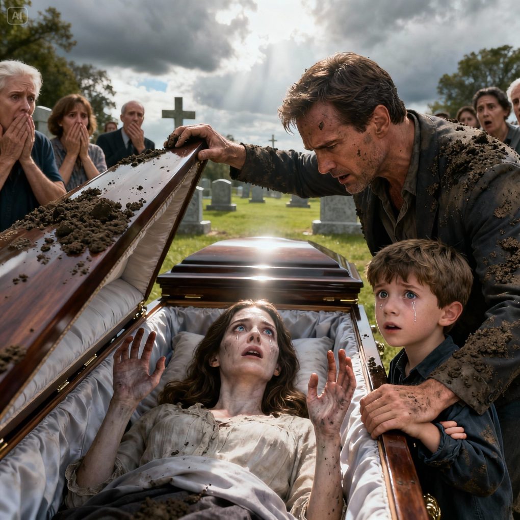 I had laid my wife to rest barely an hour when my 7-year-old son tugged my sleeve, whispering shakily, “Dad… Mom called me from inside the coffin.” I thought he was overwhelmed with grief, but the terror in his eyes made my heart sink. Without knowing why, I heard myself say, “Dig it up.” When the coffin lid swung open, everyone held their breath—because what we saw inside… changed everything.