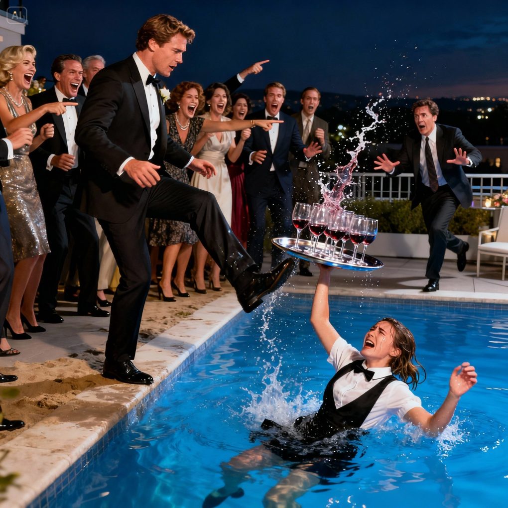 Emily plunged straight into the cold rooftop pool, the tray flying out of her hands as champagne glasses shattered on the tiles.