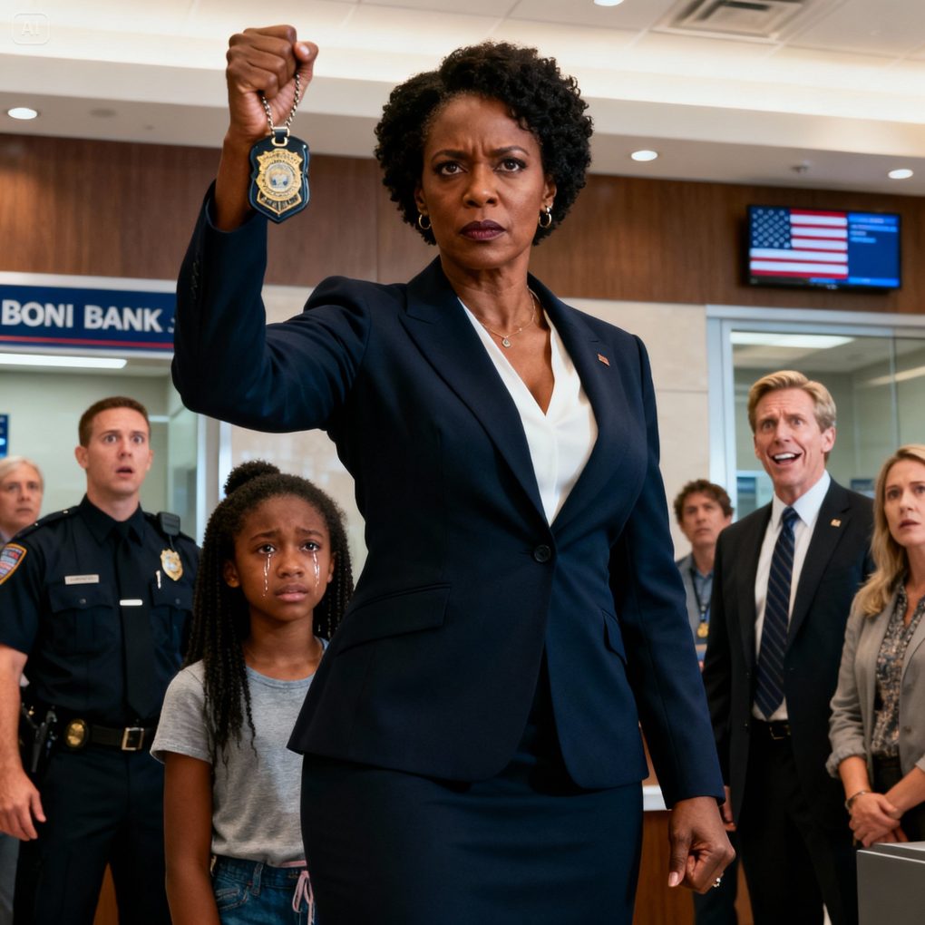 As soon as I walked into the bank lobby, I heard someone shout, “That Black girl! Call the police on her!” I saw my daughter standing frozen, eyes red, while two security guards moved toward her. My heart clenched. I marched straight toward them, my voice cold as steel: “Let her go.” The branch manager turned, smirking—until I held up my badge. His smile vanished instantly. “I’m the CEO of this bank. And that is my daughter.”