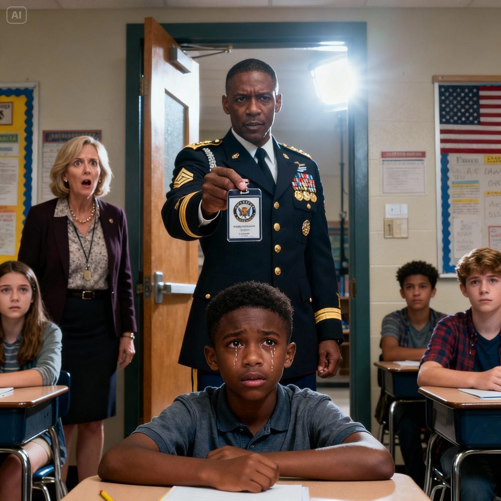“My dad works at the Pentagon,” the Black boy whispered. Laughter burst out immediately. The teacher folded her arms and sneered, “You really think we believe that kind of bragging?” The boy stayed silent, eyes glistening. Ten minutes later, heavy military boots echoed down the hallway. A high-ranking officer stepped into the classroom, his military ID gleaming in his hand. He looked around and said sternly, “Who called my son a liar?”