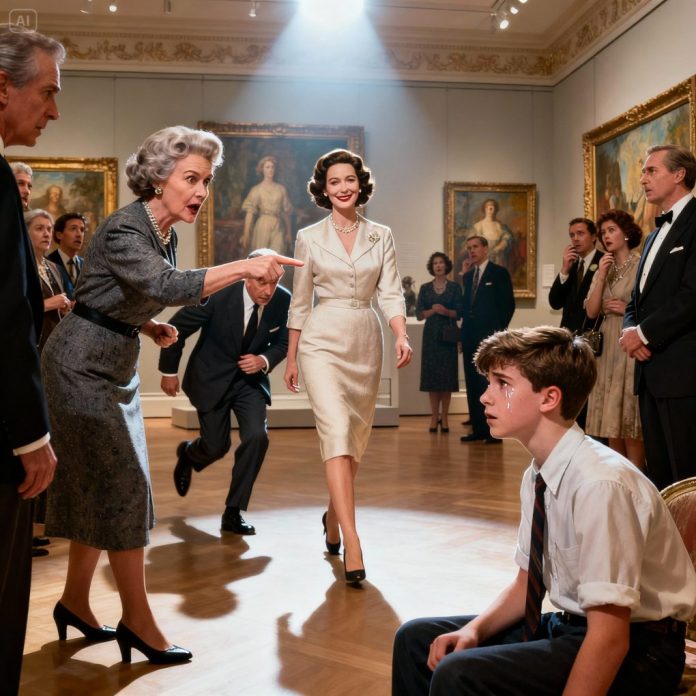 At the formal gala, my aunt jabbed a finger at my son and barked, “He doesn’t belong here. Go wait in the lobby!” My son stared at the floor, eyes glistening. I remained composed as I approached her and asked softly, “Are you certain?” Before she could react, the manager rushed in, bowing deeply. “Madam… the exhibition room has been arranged exactly as you requested.” My aunt’s expression drained of color in an instant.
