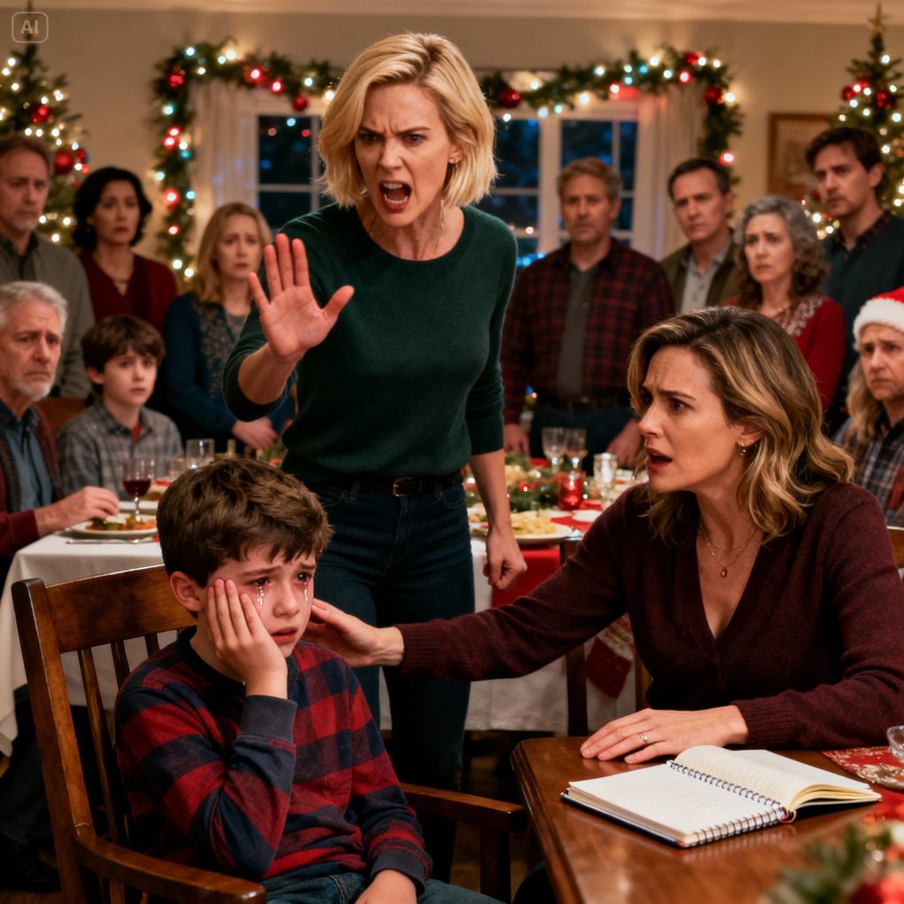 At Christmas dinner, my sister stood up and slapped my child across the face in front of the whole family. They all looked at me—waiting for me to shrink, apologize, and disappear like every other year. But this time… I sat up straight. No tears. No walking away. I opened my notebook and quietly wrote down every word they said, every glance they turned aside. My husband rested his hand on my shoulder, steady as steel. And when the undeniable truth finally came to light… my family realized something: they had just lost the control they thought they owned.