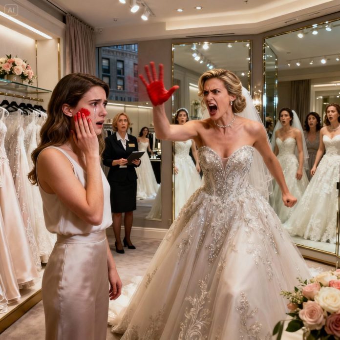 During the fitting for her $20,000 wedding dress—the dress I paid for—my sister suddenly slapped me in front of everyone. “You’re ruining my moment!” she screamed, freezing the entire boutique. I touched my cheek, then simply smiled. No arguing. I turned around, walked out, and canceled the credit card on the spot. Her half-million-dollar wedding? It collapsed within minutes—just like the slap she gave me.