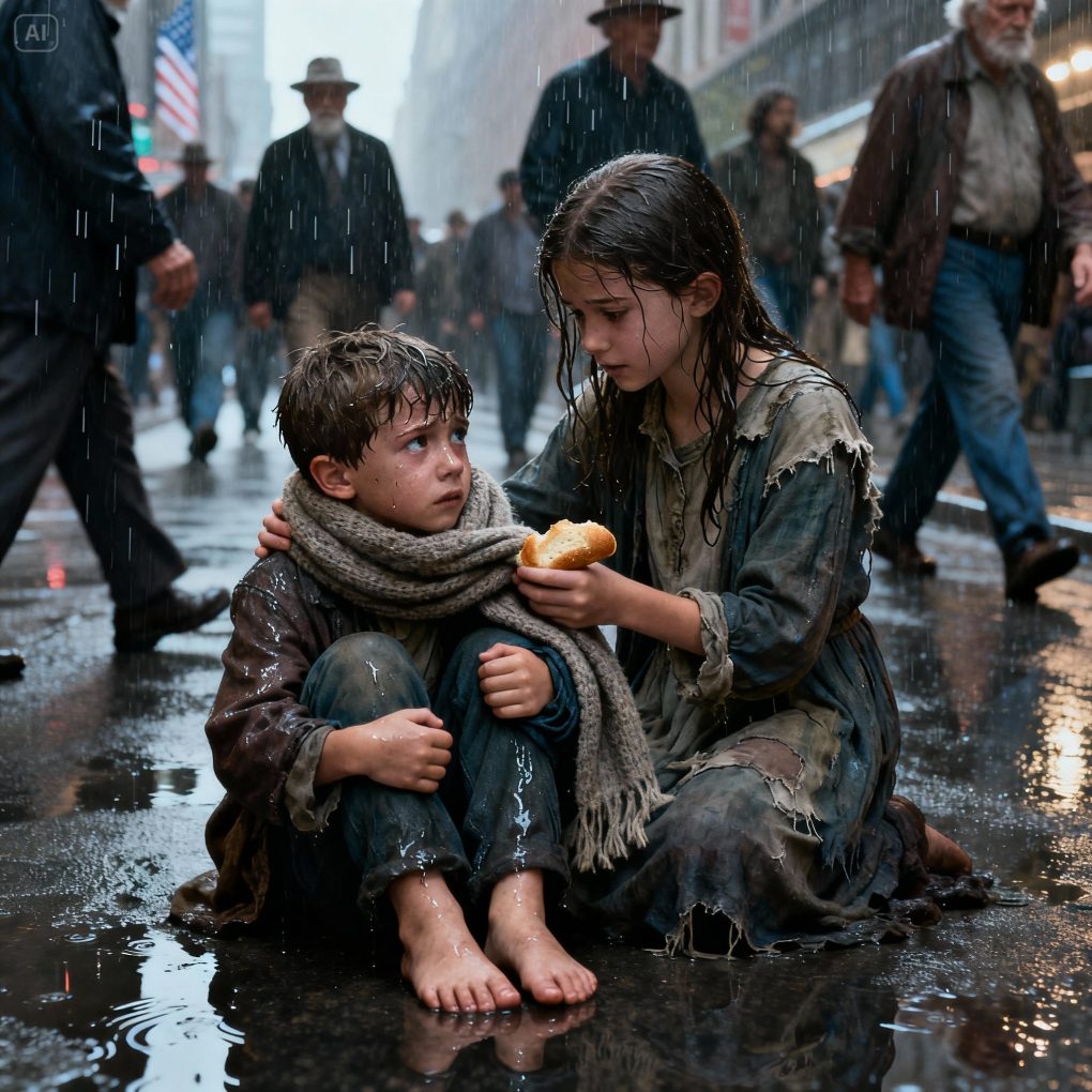 As the rain kept falling around them, two children who had almost nothing found themselves standing together—one scared and alone, the other with barely enough for herself but still willing to share what she had.