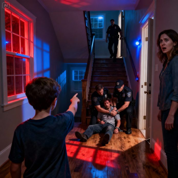 Evan stood silently at the foot of the stairs, watching everything unfold. Tears ran down his cheeks, but he straightened his spine. “I called the police,” he told his sister quietly. “I wasn’t scared.”
