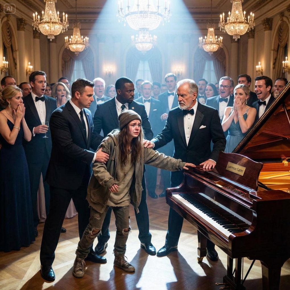 At the lavish gala, two security guards dragged a thin, homeless girl out of the hall. She struggled, her eyes locked on the grand piano sparkling under the lights. “Please! Let me play one piece… just for a plate of food!” The guests scoffed. But then, piano legend Lawrence Carter stepped forward, placed a hand on her shoulder, and said, “Let her play.” The room burst into laughter—yet only seconds later, when her fingers touched the keys… every laugh dissolved into absolute silence.